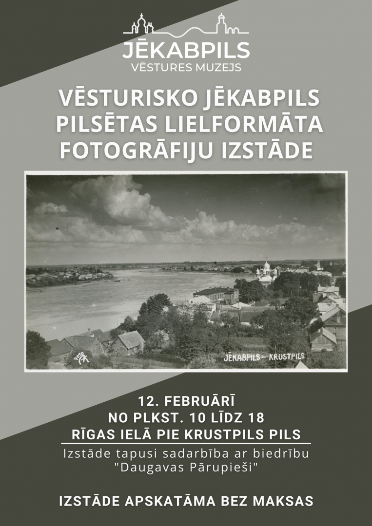 08.02.2022Par godu Jēkabpils pilsētas dzimšanas dienai 12. februārī no plkst. 10.00 - 18.00 Rīgas ielā pie Krustpils pils Jēkabpils Vēstures muzejs sadarbībā ar biedrību „Daugavas Pārupieši” ikkatram interesentam piedāvā skatīt lielformāta vēsturisko Jēkabpils fotogrāfiju izstādi.